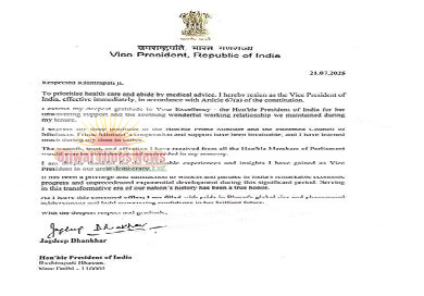 माननीय राष्ट्रपति जी सेहत को प्राथमिकता देने और डॉक्टर की सलाह को मानने के लिए मैं संविधान के अनुच्छेद 67(a) के अनुसार अपने पद से इस्तीफा देता हूं। मैं भारत के राष्ट्रपति में गहरी कृतज्ञता प्रकट करता हूं। आपका समर्थन अडिग रहा, जिनके साथ मेरा कार्यकाल शांतिपूर्ण और बेहतरीन रहा। मैं माननीय प्रधानमंत्री और मंत्रिपरिषद के प्रति भी गहरी कृतज्ञता व्यक्त करता हूं। प्रधानमंत्री का सहयोग और समर्थन अमूल्य रहा है और मैंने अपने कार्यकाल के दौरान उनसे बहुत कुछ सीखा है। माननीय सांसदों से मुझे जो स्नेह, विश्वास और अपनापन मिला है, वह मेरी स्मृति में हमेशा रहेगा। मैं इस बात के लिए आभारी हूं कि मुझे इस महान लोकतंत्र में उपराष्ट्रपति के रूप में जो अनुभव और ज्ञान मिला,